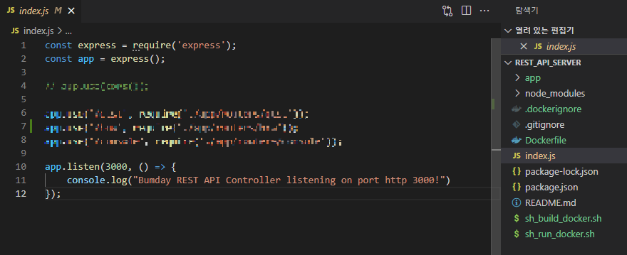 포스팅하는데 사용한 프로젝트는 NodeJS express 웹 앱이며, 실행시 웹서버가 3000번 포트로 띄어져 REST API 요청 받아 처리 및 리턴해주는 역할을 해준다.