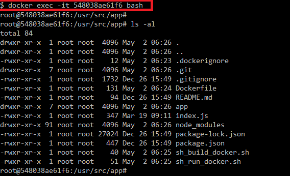 방금 실행하였던 컨테이너 ID로 들어가보면, 아래와 같이 작업 디렉터리에 프로젝트가 들어 있음을 확인할 수 있다.